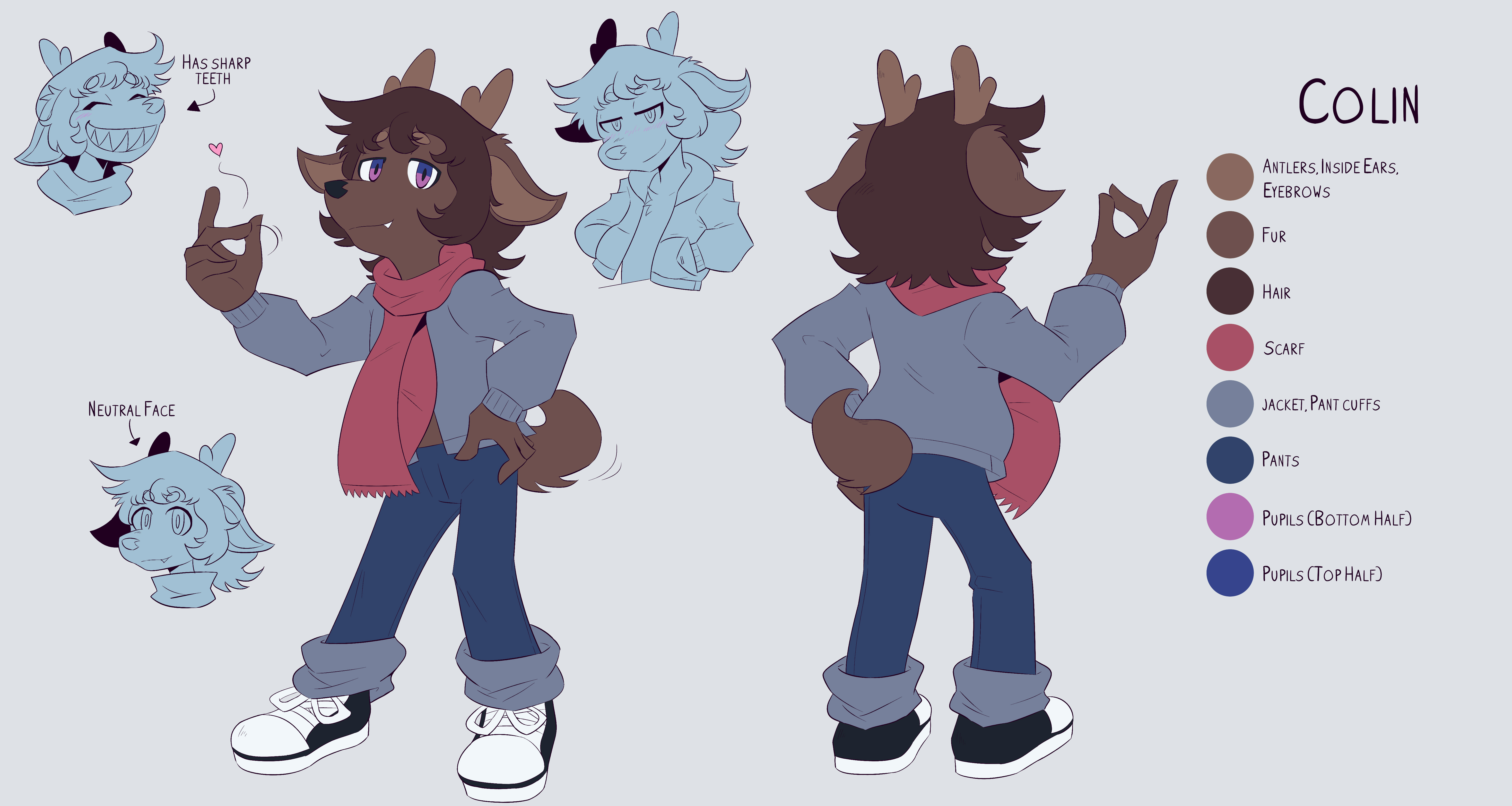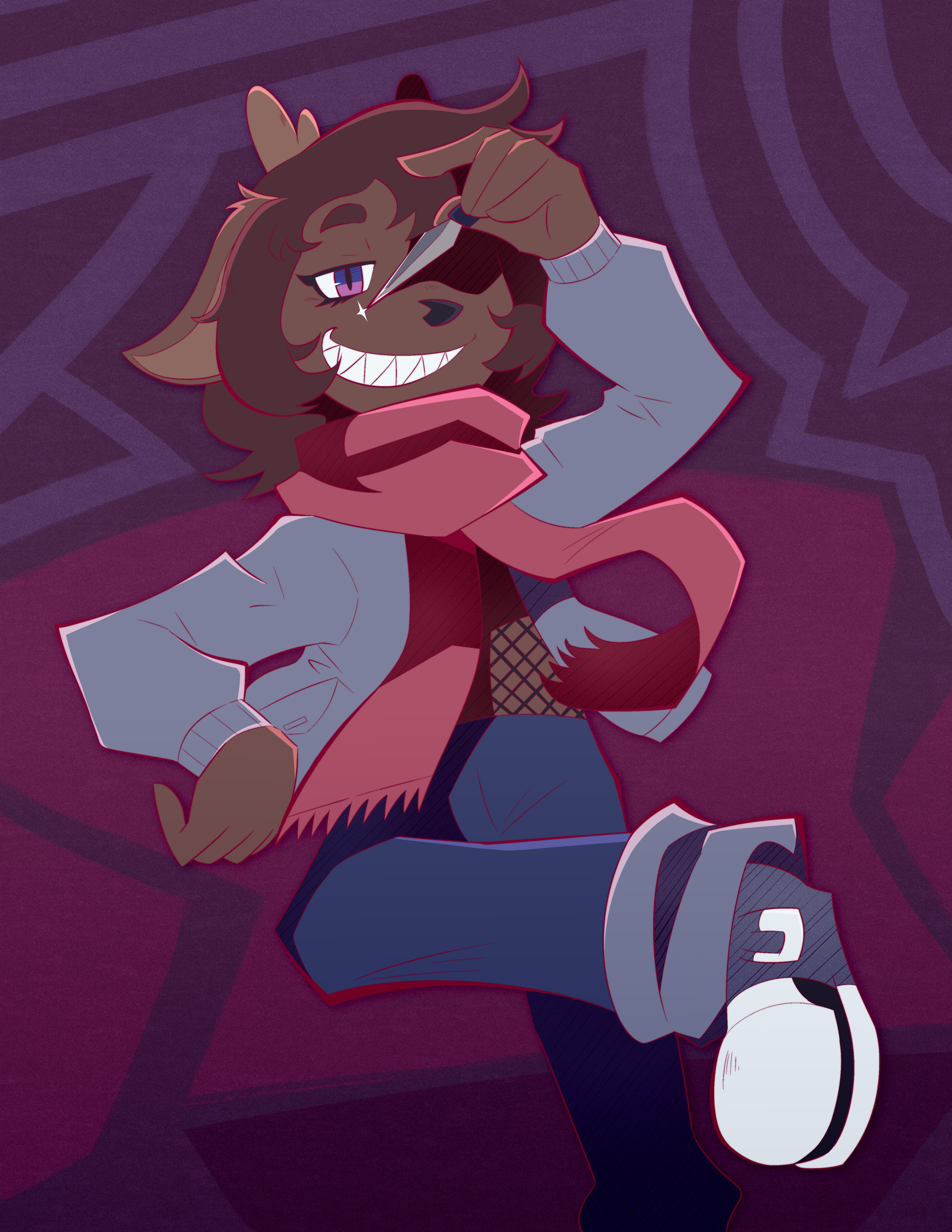 Grinning anthropomorphic deer sitting like he’s leaning on a couch,