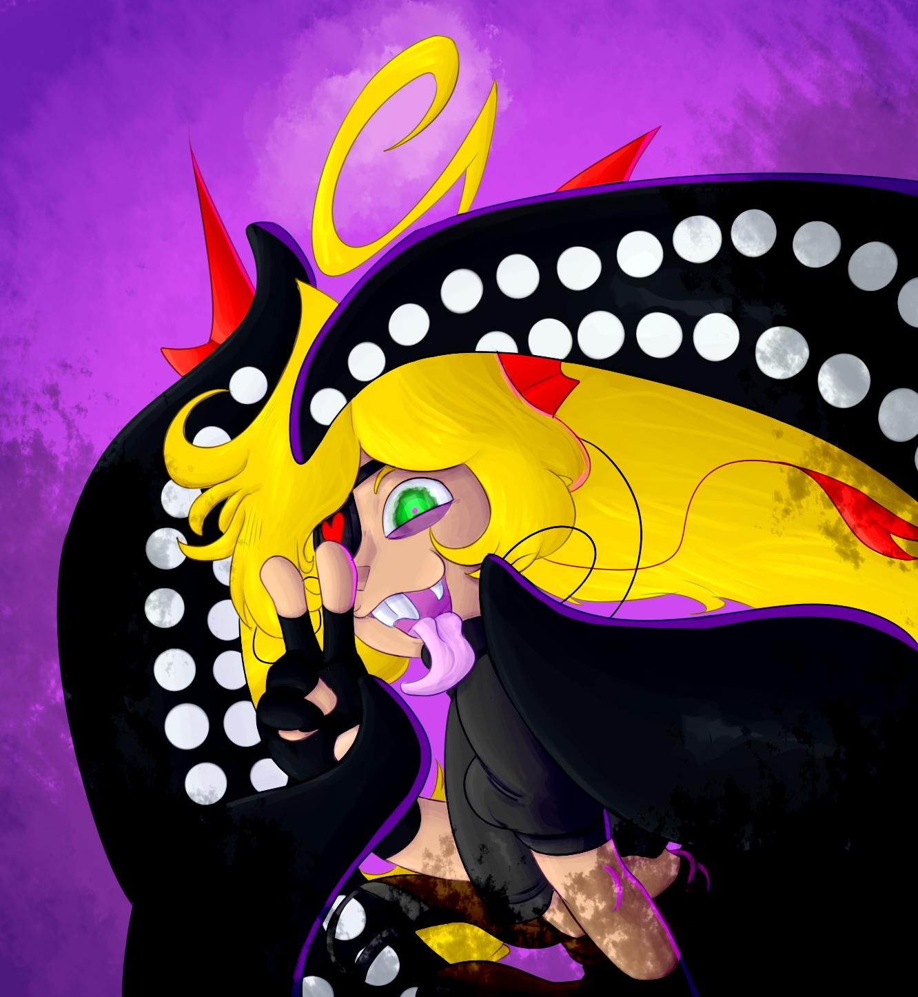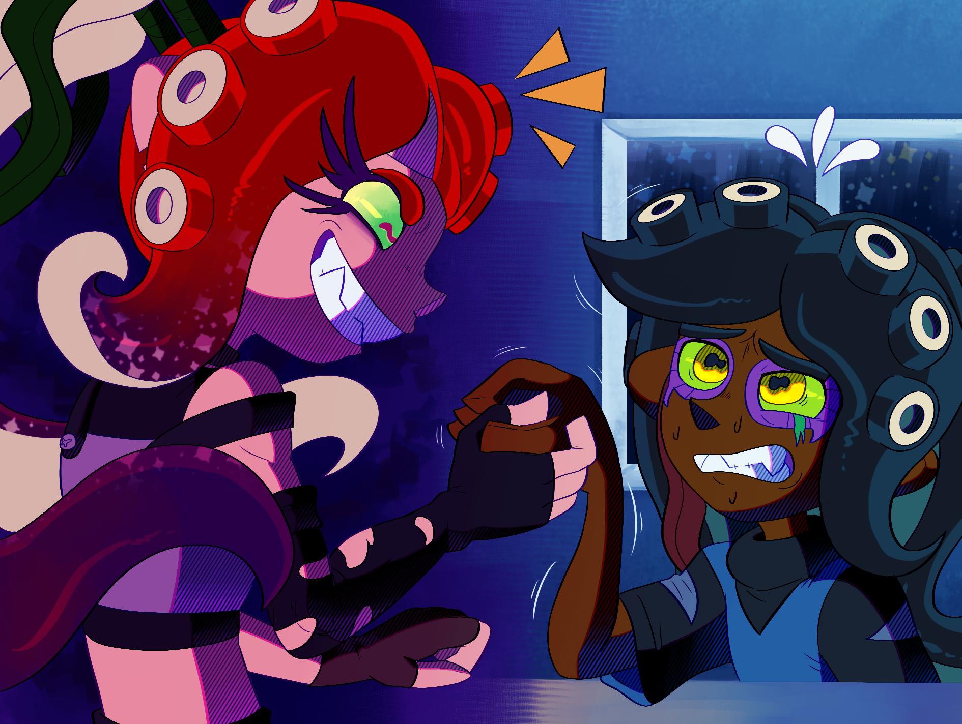 From left to right, the characters are:SCARRER, although his tentacles are tied around his body and appear to be only slightly above the typical length; they are actually very long. In fact, they are INFINITELY long but infinite tentacles come with infinite power. And as everybody knows infinite power is the most dangerous and strong of them all so he keeps his tentacles wrapped to seal their power. He has a strange fascination with apples, specifically rotten ones. He likes to hide these putrid apples around the Star Shooterz hangout, no one knows why he does this. Maybe it’s how he shows friendship.SPRINKLER, a water-elemental octoling who always appears to be drenched in water. He always has a sad look and like he has cried a lot. Despite this he is a very happy individual, but he can never smile. Legends say that if even an amoeba were to glance upon a crack of a smile emerging from his face, the world will implode in on itself. Nobody likes imploding worlds.STABBER, the hand-honcho of the gang. She’s a rowdy squid who has been in a lot of fights. She loves to fight, one time she got into a fight just because she was bored and had an itch on her back. Her weapon of choice is her knife, she never leaves home without it and ALWAYS has it on her body. Knives aren’t a turf war-regulated weapon you say? Stabber doesn’t care, she’s punk. She does what she wants.VALENTINE, a teeny itty bitty octopus who loves LOVE! There’s nothing more important and stronger to her than the power of friendship! She has a hobby of collecting friends because just like love, she LOVES friends! How could someone like her be friends with someone like Stabber? Love is blind, and she’s gots lotsa lovin in her heart to give.