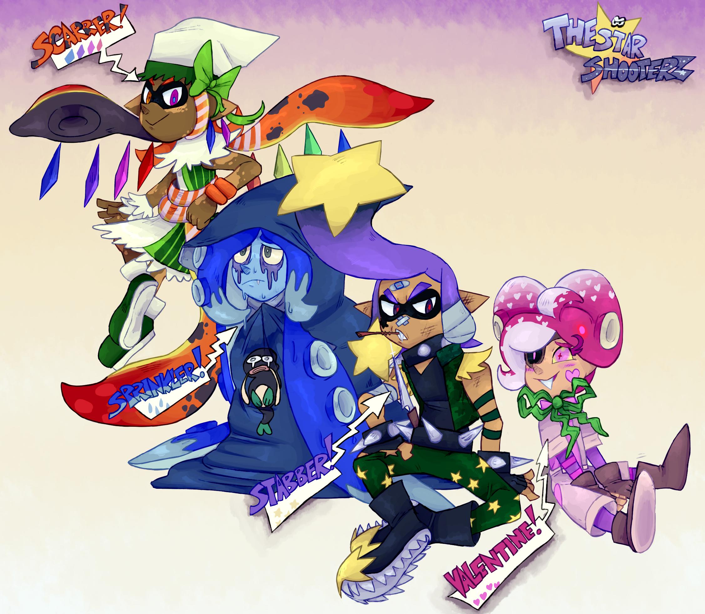 From left to right, the characters are:SCARRER, although his tentacles are tied around his body and appear to be only slightly above the typical length; they are actually very long. In fact, they are INFINITELY long but infinite tentacles come with infinite power. And as everybody knows infinite power is the most dangerous and strong of them all so he keeps his tentacles wrapped to seal their power. He has a strange fascination with apples, specifically rotten ones. He likes to hide these putrid apples around the Star Shooterz hangout, no one knows why he does this. Maybe it’s how he shows friendship.SPRINKLER, a water-elemental octoling who always appears to be drenched in water. He always has a sad look and like he has cried a lot. Despite this he is a very happy individual, but he can never smile. Legends say that if even an amoeba were to glance upon a crack of a smile emerging from his face, the world will implode in on itself. Nobody likes imploding worlds.STABBER, the hand-honcho of the gang. She’s a rowdy squid who has been in a lot of fights. She loves to fight, one time she got into a fight just because she was bored and had an itch on her back. Her weapon of choice is her knife, she never leaves home without it and ALWAYS has it on her body. Knives aren’t a turf war-regulated weapon you say? Stabber doesn’t care, she’s punk. She does what she wants.VALENTINE, a teeny itty bitty octopus who loves LOVE! There’s nothing more important and stronger to her than the power of friendship! She has a hobby of collecting friends because just like love, she LOVES friends! How could someone like her be friends with someone like Stabber? Love is blind, and she’s gots lotsa lovin in her heart to give.