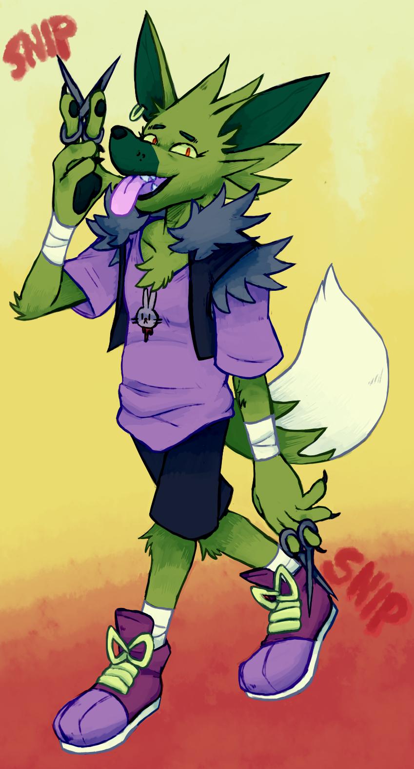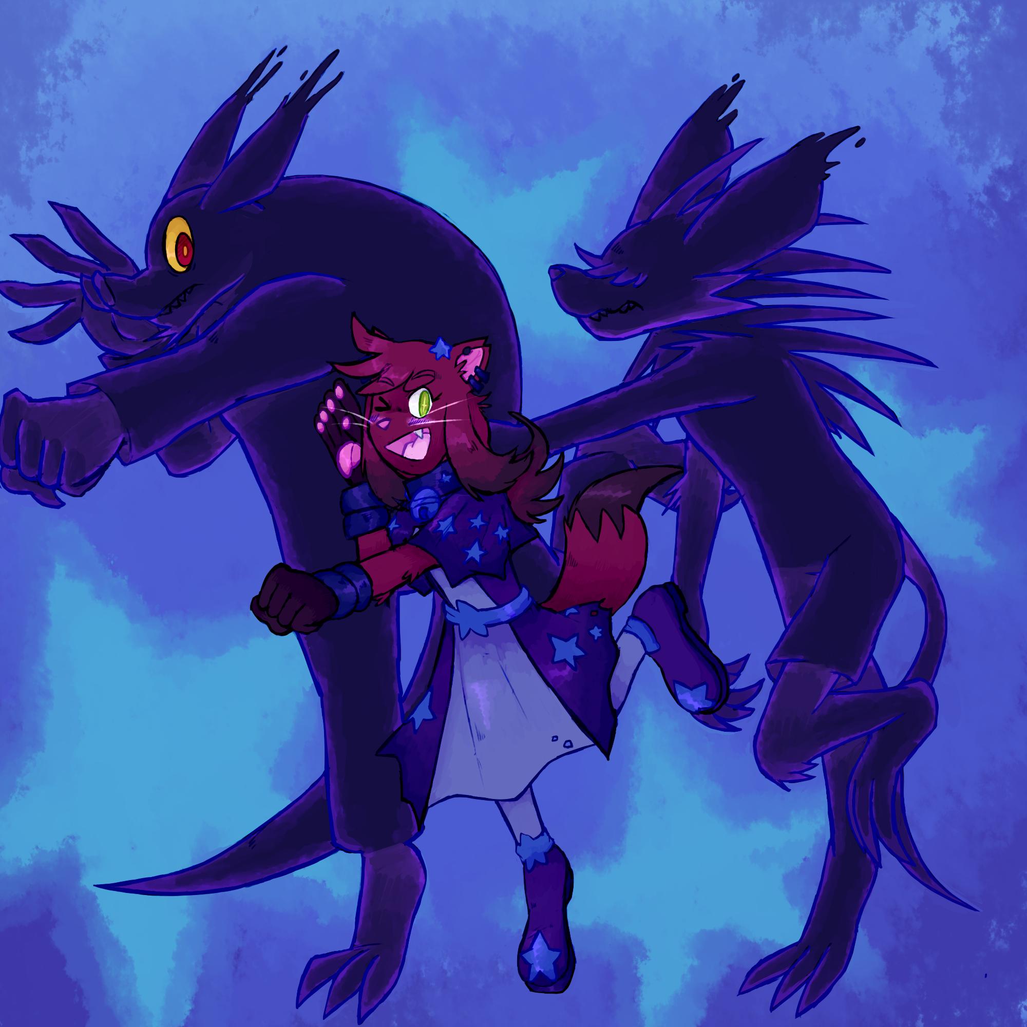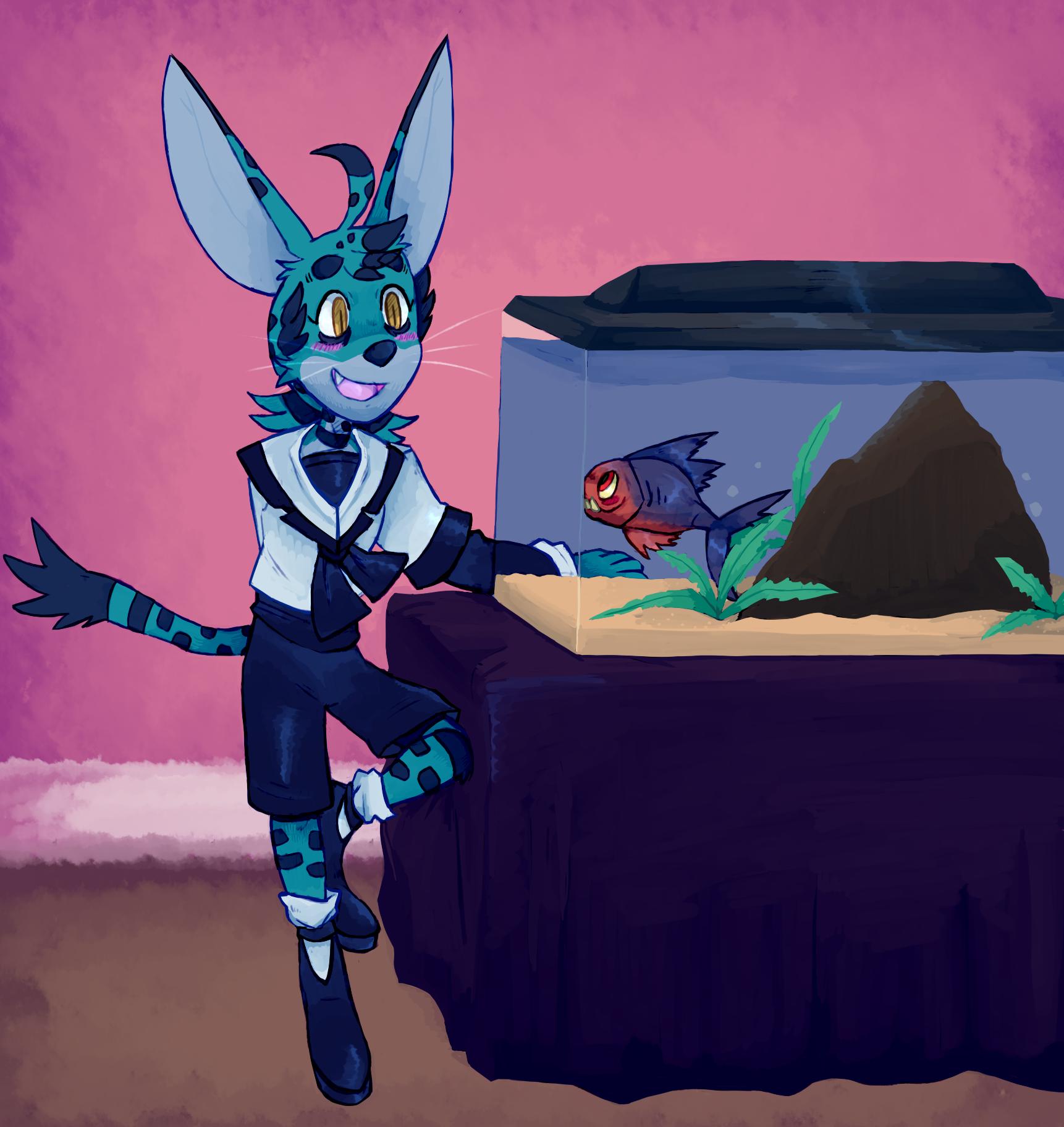 Their name is Rena Patel, they’re an energetic serval who can be kind of a klutz sometimes. They like to go out and watch fish, which is how they met their pet piranha (Rena named it Snappy).