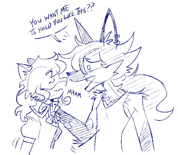 A doodle of two anthropomorphic animals. The maned wolf, with a silly expression on her face, asks “You want me to hold you like this??”, the otter she’s holding by the shoulder responds with “mhmm”]