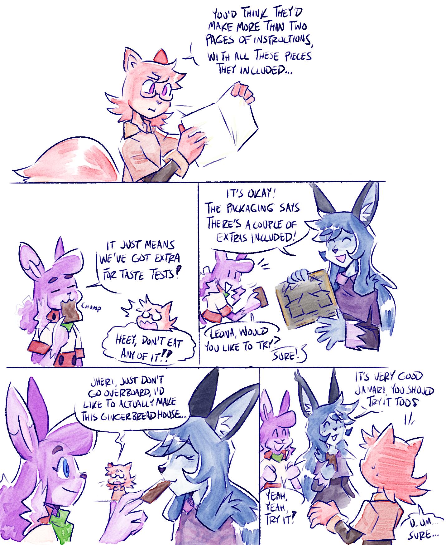 [image description: A quickly drawn 5 panel comic. First panel: Jamari is holding a piece of paper sideways, staring intently at the instructions listed on it, she says “You’d think they’d make more than just two pages of instructions, with all these pieces they included…” Second panel: Jheri is taking a bite of one of the gingerbread house’s pieces, she says “It just means we’ve got extra for taste tests!”, chomp sound effect. A surprised Jamari nervously exclaims “Heey, don’t eat any of it!!” Third panel: Leona is holding the gingerbread house’s box, smiles and says “It’s okay! The packaging says there’s a couple of extras included!” Jheri turns around and asks “Leona, would you like to try?”, Leona responds with “Sure!” Fourth panel: Jheri points the gingerbread piece to Leona and she takes a bite. Jamari, in the back, says “Jheri, just don’t go overboard, I’d like to actually make this gingerbread house…” Fifth panel: Jheri and Leona look towards Jamari smiling, Leona cheerfully says “It’s very good Jamari, you should try it too.” Jheri excitedly chants “Yeah, yeah, try it!” Jamari, a little shocked and sweating, stammers “U..um… Sure…” End description.]