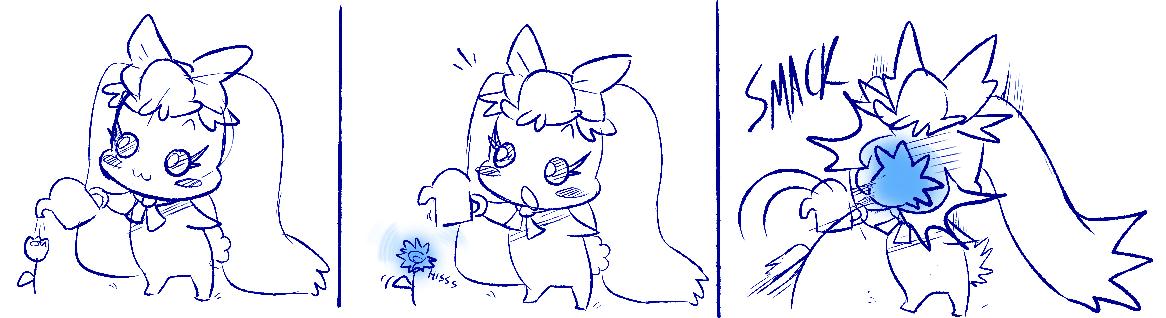 [Image description: A three-panel comic based on Tropical-Rouge PreCure. In the first panel the Witch of Destruction walks past Butler, the Butler says “Witch, where have you been all this time?” In the second panel the Witch answers “I met a human… She was pretty nice…” while holding her cheek, slouching. In the third panel Butler nervously thinks to himself “It can’t be… Is it one of those ‘human g-f’s (girlfriends) I’ve heard stories about??….” while sweating profusely. End description.]