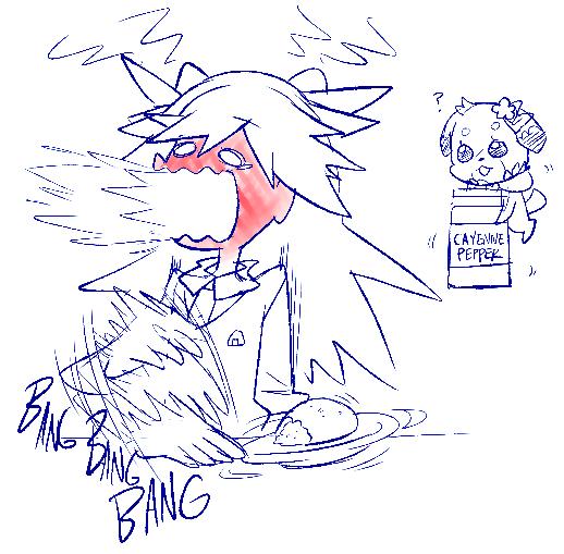 [Image description: Yui from Delicious Party PreCure is furiously banging on the table, her steaming face burns bright-red while flames shoot out of her mouth after eating very spicy food. Her banging on the table shakes her plate of curry bread with a bite taken. Sound effects: bang, bang, bang. On the side of Yui is Pam-Pam confused, with a vacant look, holding a bottle of cayenne pepper. End description]