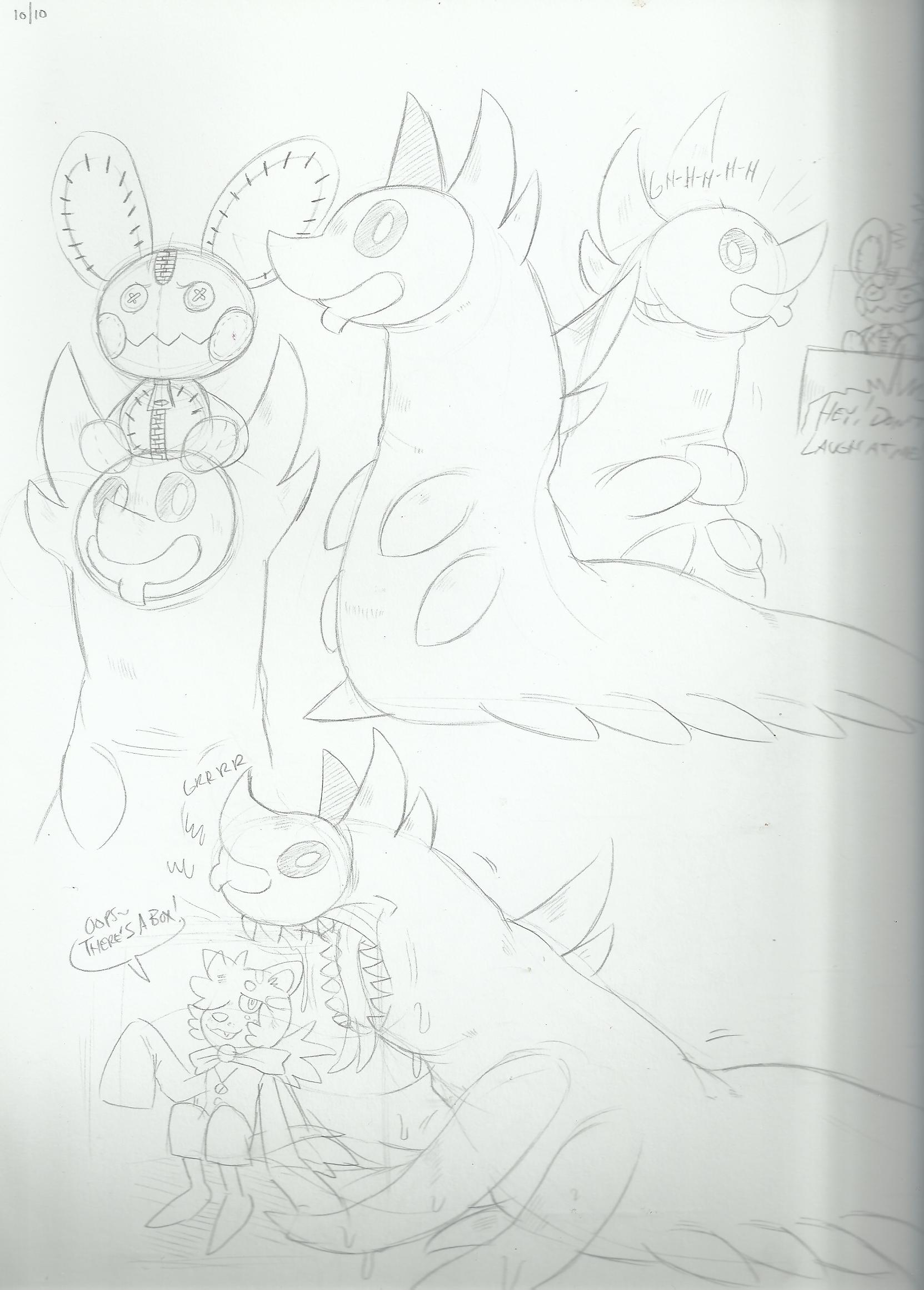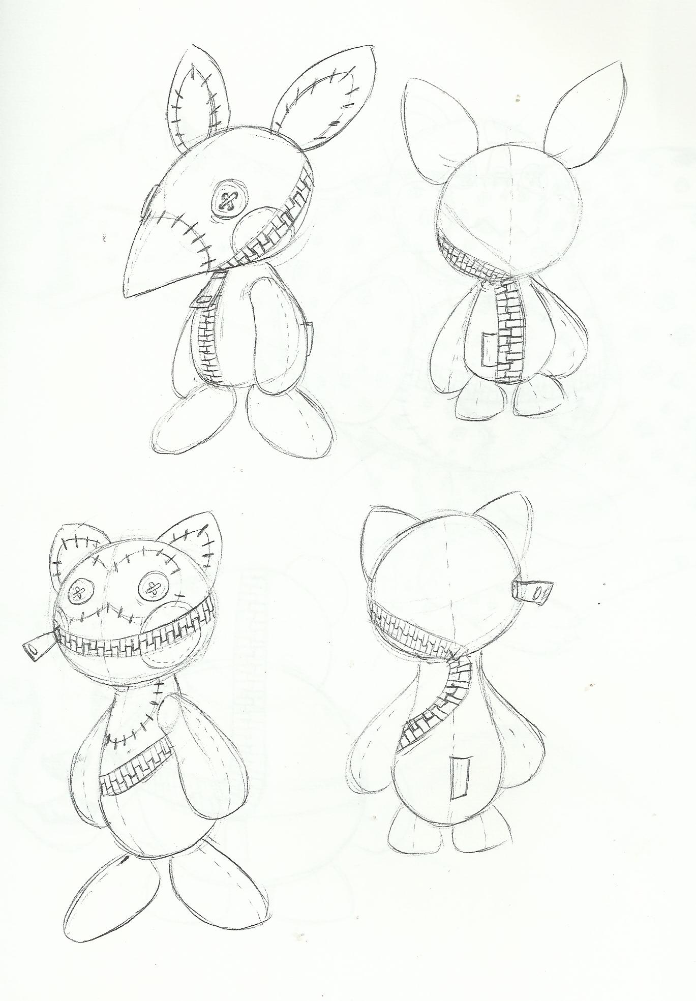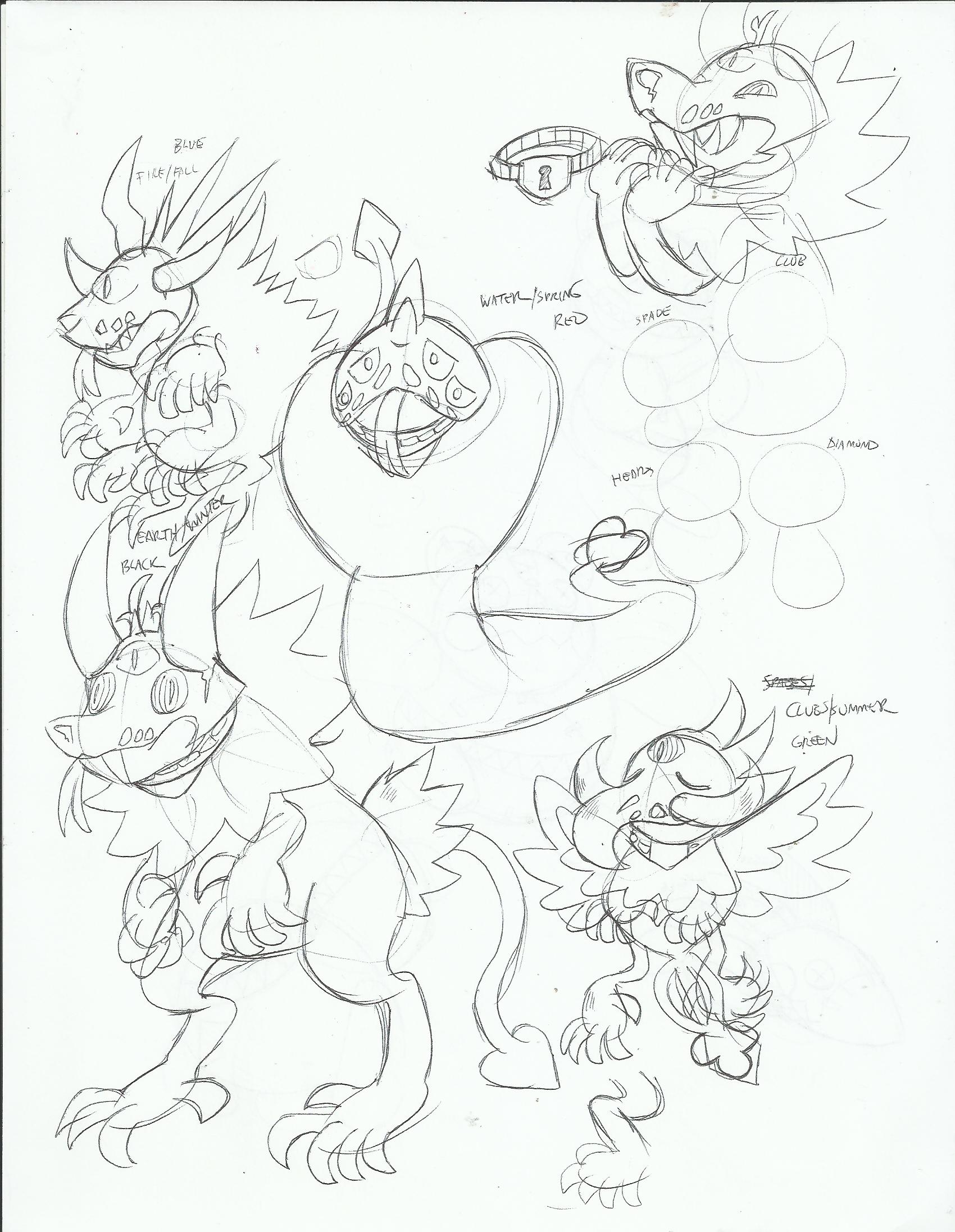 None of the monsters have actual names but Zephyr does refer to them by nicknames, the group I based on those card symbols are nicknamed after their symbols. They have a magical necklace put on them by Zephyr to bind them to the plushie bodies (hand-made by Zephyr) and it also hurts them if they try to attack/kill Zephyr. The last monster (Zephyr calls it “Greedy” since it eats a lot… and tries to kill and eat them) doesn’t have that necklace because it was strong enough to break it off when Zephyr put one on it. Zephyr likes to tease it when it tries to kill them (the thought of killing the skunk one day, fills the monster with determination).