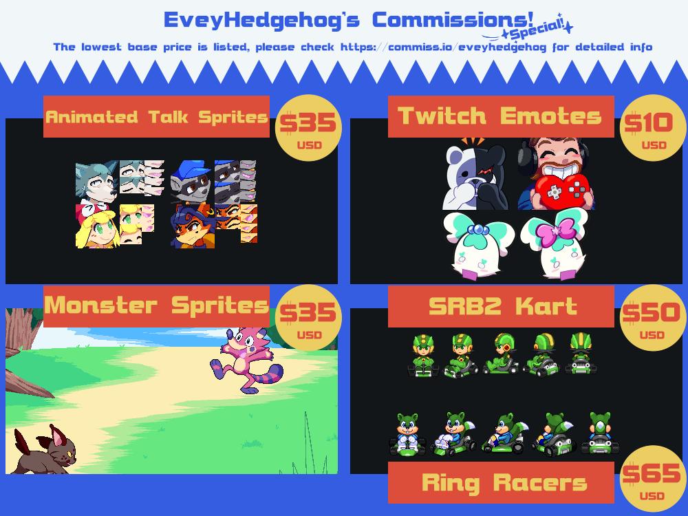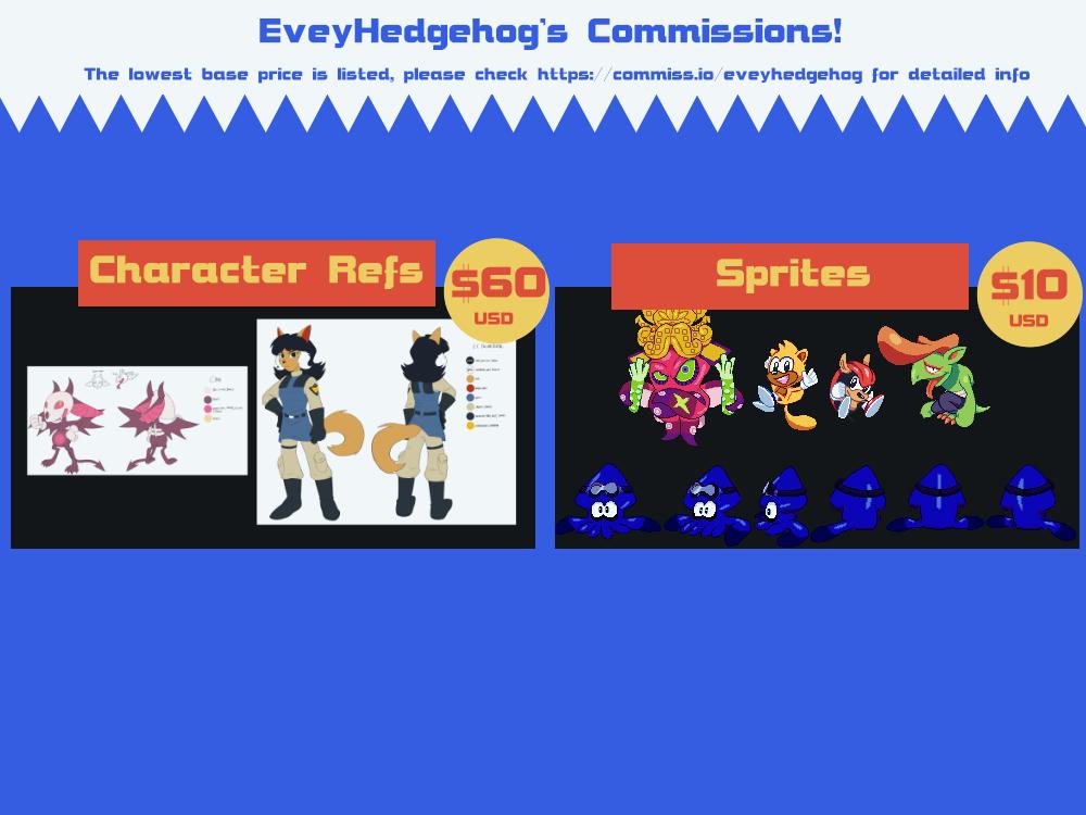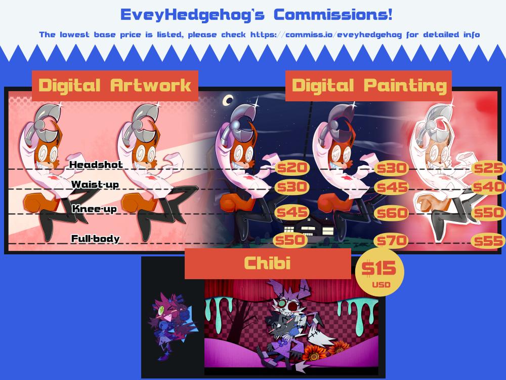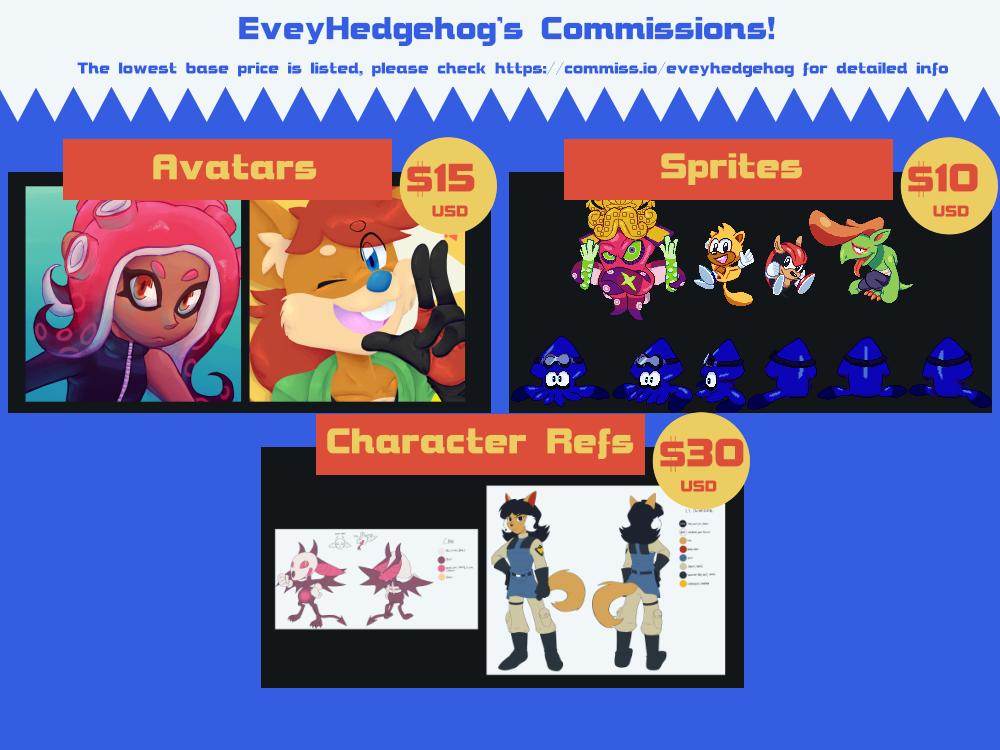 Here’s the very delayed, new commission sheet with updated prices and new choices. Go over to https://commiss.io/eveyhedgehog to see more detailed info about each there as well as sending a project if you’re interested, thank you!