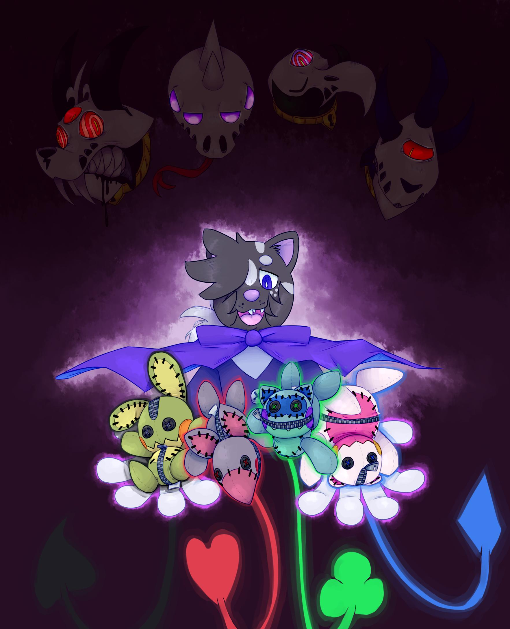 None of the monsters have actual names but Zephyr does refer to them by nicknames, the group I based on those card symbols are nicknamed after their symbols. They have a magical necklace put on them by Zephyr to bind them to the plushie bodies (hand-made by Zephyr) and it also hurts them if they try to attack/kill Zephyr. The last monster (Zephyr calls it “Greedy” since it eats a lot… and tries to kill and eat them) doesn’t have that necklace because it was strong enough to break it off when Zephyr put one on it. Zephyr likes to tease it when it tries to kill them (the thought of killing the skunk one day, fills the monster with determination).